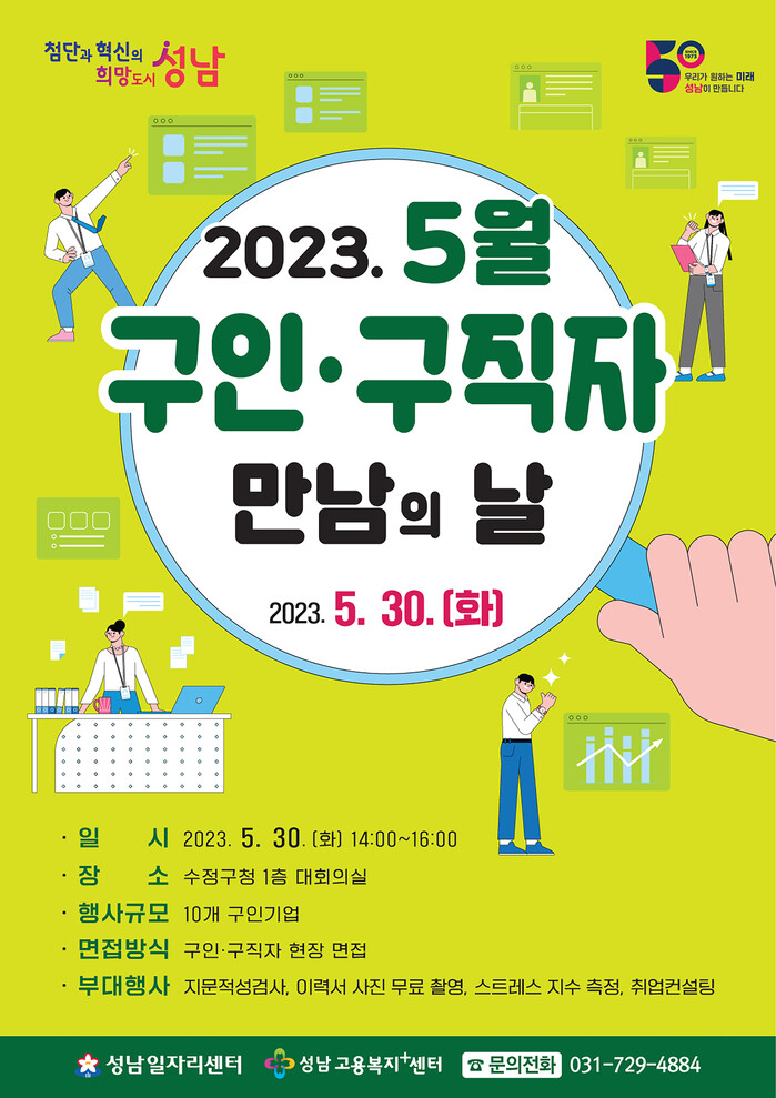성남시는 오는 5월 30일 오후 2시~4시 수정구청 1층 대회의실에서 ‘5월 구인·구직자 만남의 날’ 행사를 연다.