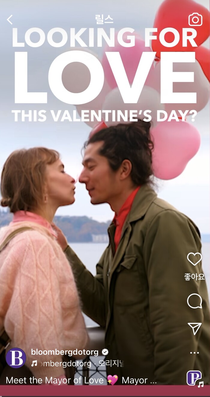 블룸버그재단은 현지 시간으로 14일 “올해 밸런타인데이에 사랑을 찾고 계신가요?”라는 제목의 영상을 인스타그램, 페이스북, 링크드인(LinkedIn), 스레드(Threads), 엑스(X) 등 공식 계정 5곳에 게시했다. 미국 전 뉴욕 시장 마이클 블룸버그가 사재를 털어 설립한 블룸버그재단은 전 세계적으로 공익을 증진하고 삶의 질을 개선하는 다양한 자선활동을 펼치고 있다.