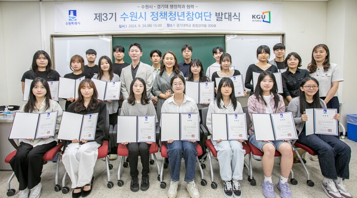 24일 경기대 종합강의동에서 열린 제3기 수원시 정책청년참여단 발대식에는 정책청년참여단 19명과 경기대 행정학과 박현욱 교수, 수원시 관계자 등이 참석했다.