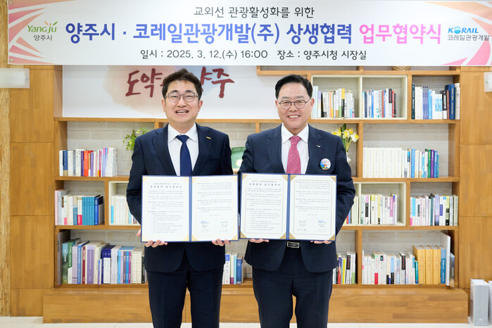 양주시(시장 강수현)가 12일 오후 ‘코레일관광개발(주)(대표이사 권백신)’과 함께 교외선 관광수요 유치를 위해 철도관광 인프라 및 홍보 채널 활용을 통한 ‘지역관광 활성화 상생협력 업무협약’을 체결했다고 밝혔다.
