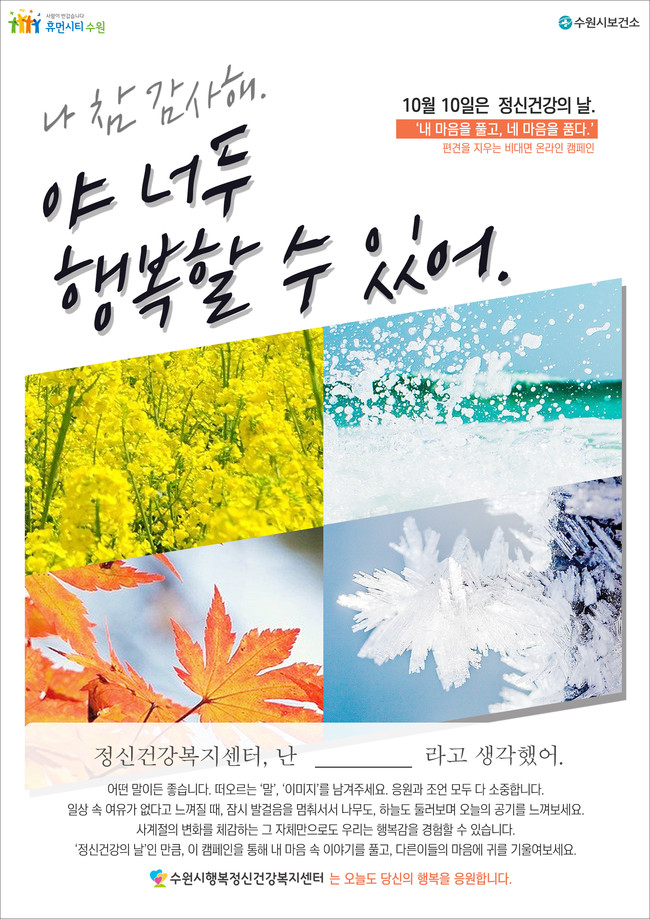 수원시보건소 관계자는 “코로나19 장기화로 많은 시민이 공포와 불안, 스트레스, 우울을 느끼고 있다”며 “이번 온라인 캠페인을 통해 시민들이 정신건강에 대한 편견을 없애고, 심적으로 어려움을 겪는 분은 상담 등으로 도움을 받길 바란다”고 말했다.