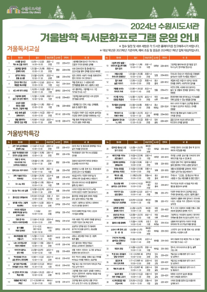 겨울방학 특강은 새학교, 새친구를 주제로 한 그림책 독후 활동인 ‘예비초등생을 위한 겨울나기(서수원도서관, 1월 15~17일)’, 생활 속 환경문제를 살펴보며 자연과 더불어 살아가는 방법을 배울 수 있는 ‘우리는 환경을 생각하는 자연인(일월도서관, 2월 19~22일)’ 등이 있다.