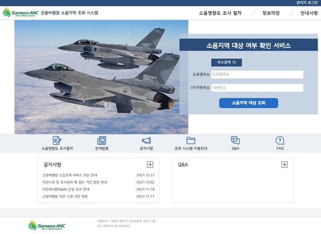 군용비행장 소음 지역 조회시스템(kmnoise.samwooanc.com)에 접속해 자신의주소를 입력하면 소음 대책 지역 해당 여부를 확인할 수 있다.