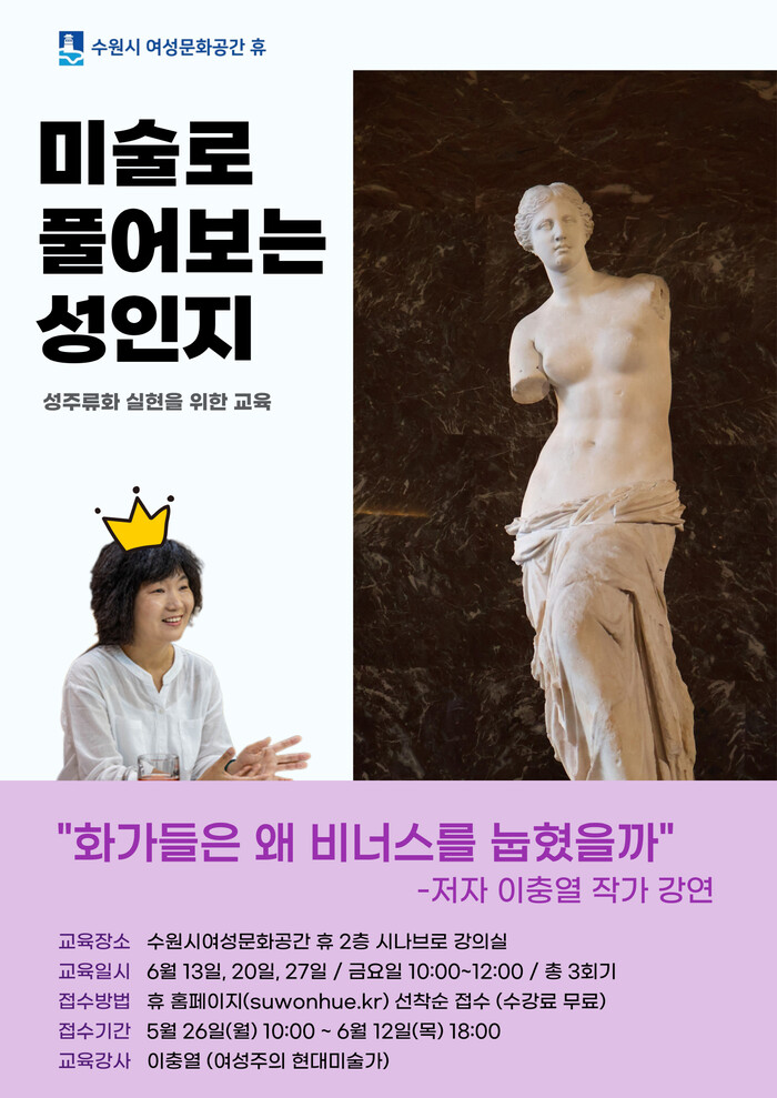 수원시 여성문화공간-휴(休)가 성평등한 지역공동체 형성을 위한 성인지 교육 프로그램 ‘미술로 풀어보는 성인지 - 화가들은 왜 비너스를 눕혔을까’의 참가자를 모집한다.