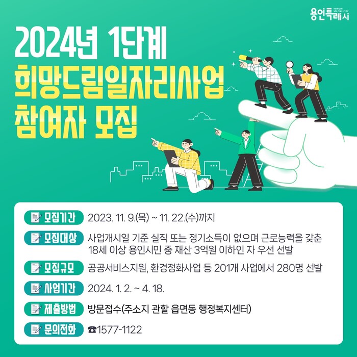 용인특례시(시장 이상일)는 오는 9일부터 22일까지 '2024년 1단계 희망드림 일자리' 사업 참여자 280명을 모집한다고 8일 밝혔다.