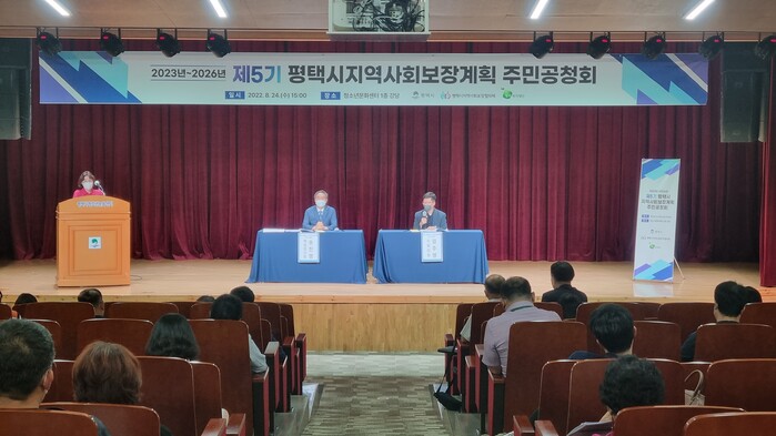 평택시(시장 정장선)는 지난 24일 청소년문화센터 공연장에서 시민, 사회복지 관련기관·단체 종사자 및 지역사회보장협의체 위원 등 150여 명이 참석한 가운데 제5기 지역사회보장계획 수립(단장 김주영, 책임연구원 송진영)을 위한 공청회를 개최했다.