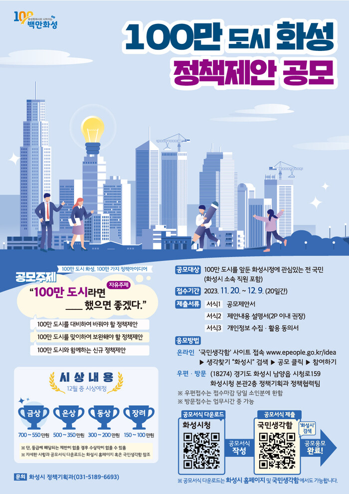 이번 공모는 화성시 인구가 올 연말 100만 명을 돌파할 것으로 예상됨에 따라, 100만 도시에 걸맞은 창의적인 정책 아이디어를 발굴하기 위함으로 20일부터 12월 9일까지 20일간 진행된다.