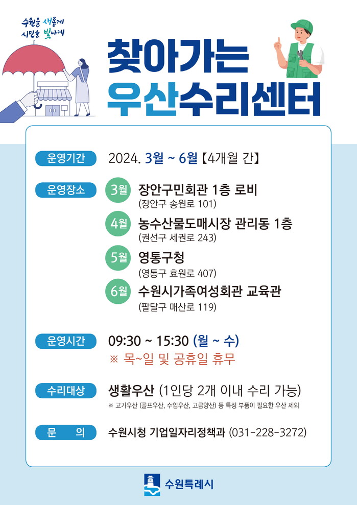 수원시(시장 이재준)가 3월부터 6월까지 4개 구를 순회하며 고장 난 우산을 무료로 수리해 주는 ‘찾아가는 우산수리센터를’ 운영한다.
