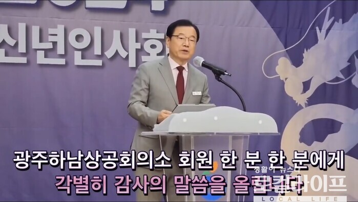 | ▲ 이현재 하남시장이 ‘2024년 광주하남상공회의소 신년인사회’에 참석해 인사말을 하고 있다. (사진출처=이현재 페이스북 영상 갈무리) |