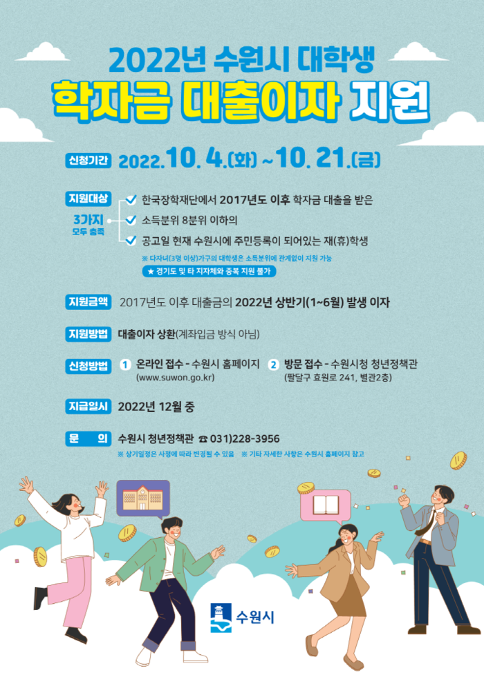 수원시가 10월 4일부터 21일 오후 6시까지 ‘2022년 수원시 대학생 학자금 대출이자 지원 사업’ 대상자를 모집한다.