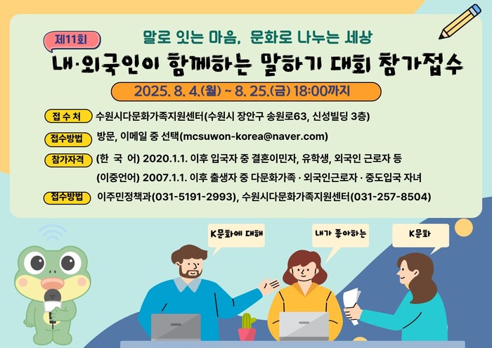 수원시(시장 이재준)는 ‘제11회 내외국인이 함께 하는 말하기대회’ 참가자를 25일까지 모집한다.