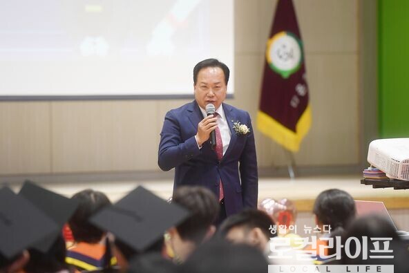 | ▲ 이권재 오산시장이 다온초등학교 졸업식에 참석해 인사말을 하고 있다. (사진출처=이권재 페이스북) |