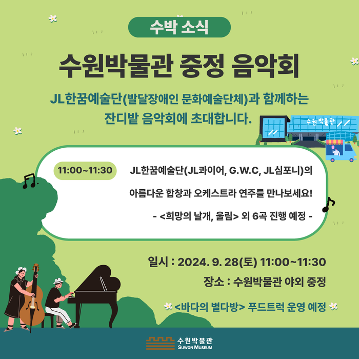 수원박물관이 JL한꿈예술단과 함께 28일 수원박물관 야외 중정(잔디밭)에서 음악회를 개최한다.