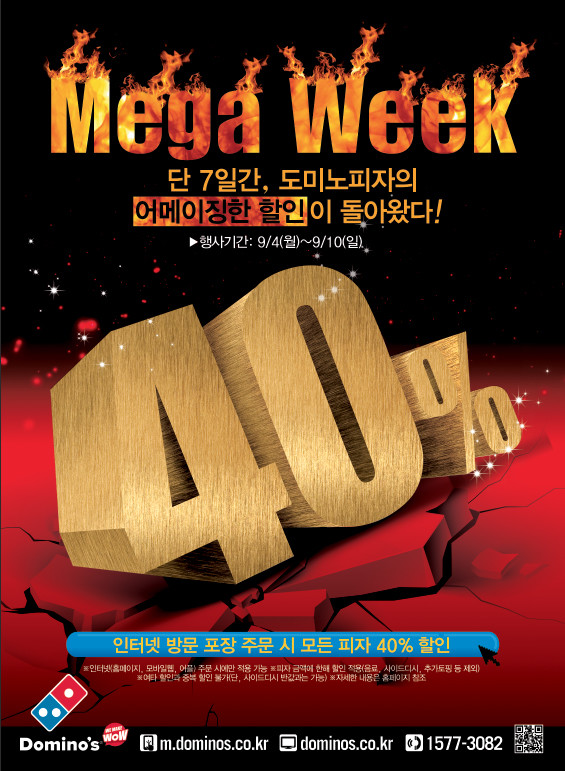 ‘도미노 메가위크’ 프로모션은 가을을 맞아 일주일 동안 진행되는 도미노피자만의 파격 할인 프로모션으로, 온라인(홈페이지, 모바일 웹, 애플리케이션) 주문 후 방문 포장 시 도미노피자의 모든 피자(L, M)를 40% 할인된 가격에 즐길 수 있다.