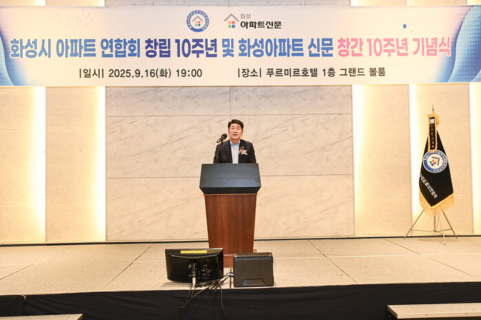 화성특례시의회(의장 배정수)는 16일, 푸르미르호텔 그랜드 볼룸홀에서 열린 ‘화성시아파트연합회 창단 10주년 및 화성아파트신문 창간 10주년 기념식’에 참석해 아파트 공동체 문화 발전과 건강한 주거 문화를 응원했다.