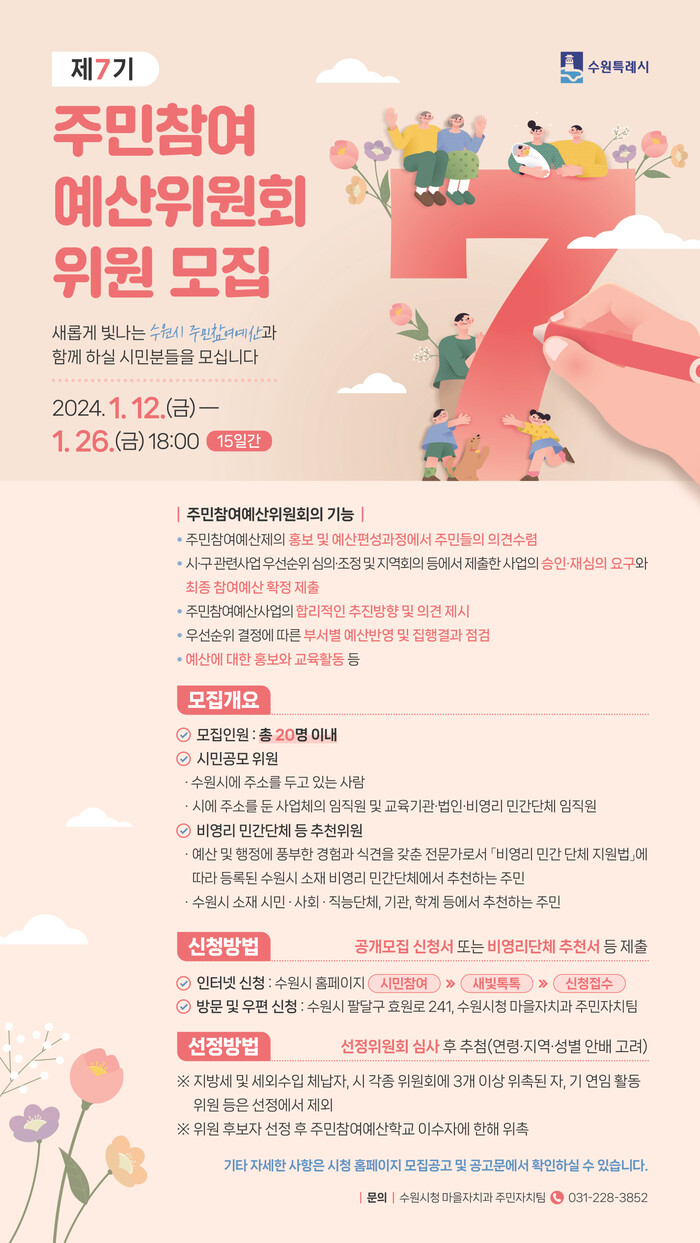 실질적 주민자치를 실현하기 위해 2024년부터 주민자치회 중심으로 주민참여예산제를 운영하는 수원시가 제7기 주민참여예산 위원 20명을 1월 12일부터 1월 26일 오후 6시까지 공개 모집한다.