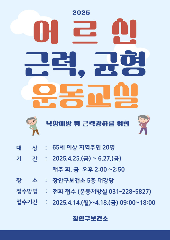 장안구보건소 관계자는 “어르신들에게 꼭 필요한 낙상 예방 운동과 건강관리 교육을 함께 제공하는 프로그램”이라며 “맞춤형 건강 프로그램에 참여해 활기차고 안전한 노후를 보내시길 바란다”고 말했다.