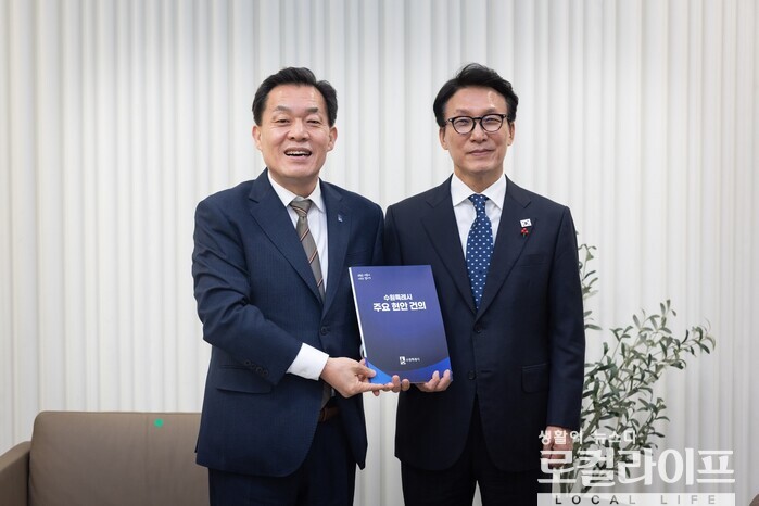 | ▲ 이재준 수원특례시장(왼쪽)이 김민석 국무총리(오른쪽)에게 지역 주요 현안을 담은 책자를 전달하고 있다. (사진출처=이재준 페이스북) |