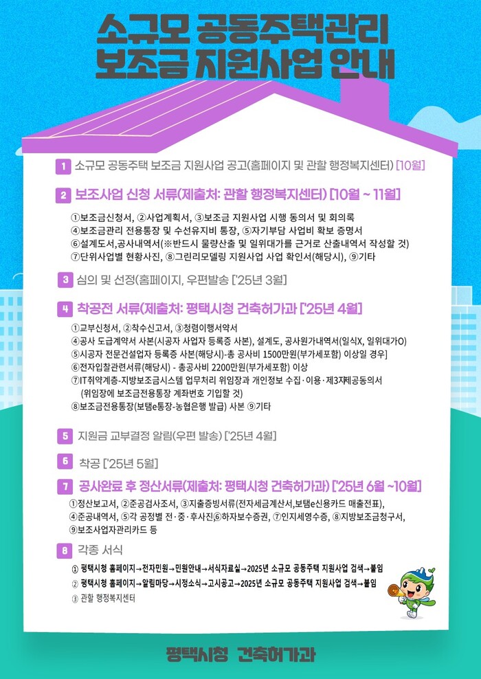 시 관계자는 “2025년에는 해당 사업을 통해 보다 많은 소규모 공동주택 주민들이 안전하고 쾌적한 주거환경 속에서 지낼 수 있도록 노력할 것이며, 보조사업 지원을 아끼지 않겠다”고 밝혔다.