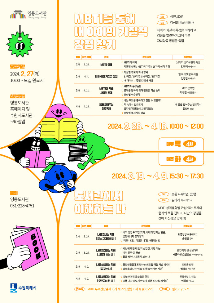 수원시 영통도서관이 ‘도서관에서 이해하는 나’와 ‘MBTI를 통해 내 아이의 기질적 강점찾기’ 프로그램 참가자를 2월 27일부터 모집한다.
