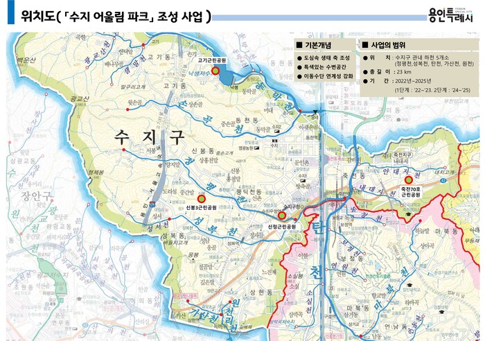 용인시가 시 수변공원화 사업의 랜드마크, '어울林(림)파크' 조성을 진행중인 가운데, 수지구도 관내 5개의 하천과 4개의 공원을 연계하는 23Km 길이의'수지구 어울림파크' 조성에 나선다.