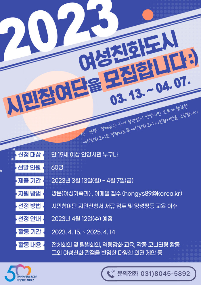 안양시는 모두가 차별없이 행복한 여성친화도시 조성에 함께할 ‘여성친화도시 시민참여단(이하 시민참여단)’을 모집한다고 13일 밝혔다.