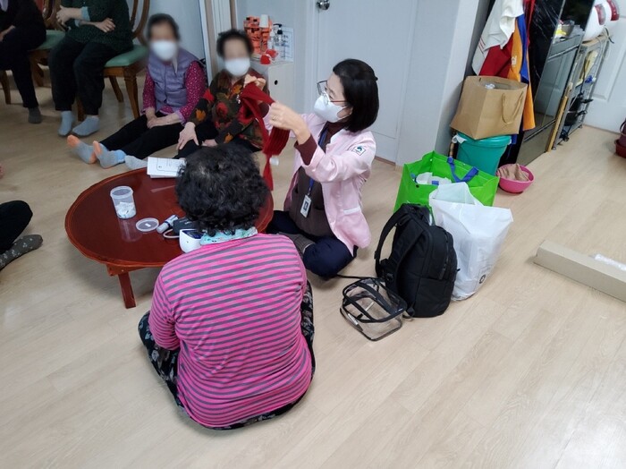 전문 인력 간호사 등 12명으로 구성된 방문보건인력을 지역 맞춤형 담당제로 편성하여, 의료서비스 이용이 어려운 취약계층 가구에 보온용 목도리 등을 제공하고, 경로당을 방문하여 한파 시 유의할 건강행동을 위한 교육 자료를 배부하고 혈압·혈당 등 기초검사를 통해 건강상태 모니터링을 실시했다.