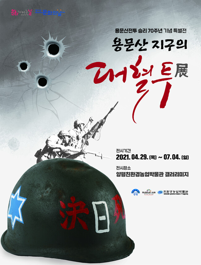양평친환경농업박물관(관장 진유범)에서는 오는 29일부터 용문산전투 승리 70주년 특별 기념전 ‘용문산지구의 대혈투 展’을 개최한다. 용문산전투는 1951년 5월, 양평 용문산 북쪽 지역에서 벌어진 국군 제 6사단(청성부대)과 중공군 제 63군의 전투를 말한다.