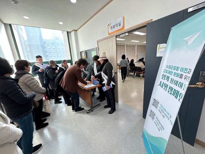 [로컬라이프] 수원 군 공항 이전 및 경기통합국제공항추진 시민협의회(이하 ‘시민협의회’)는 26일 영통1동에서 개최된 단오어린이공원과 영통사 근린공원 리모델링 계획(안) 주민설명회에 참여하여 ‘고도제한 완화 현장 서명 캠페인’을 실시했다고 밝혔다.