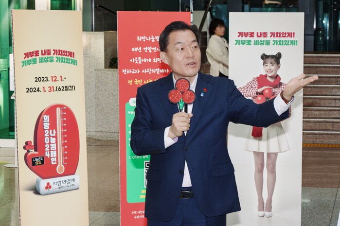 수원시는 4일 시청 본관 로비에서 ‘사랑의 온도탑’ 제막식을 열고, ‘희망 2024 나눔캠페인’을 시작했다. 10억 원 모금을 목표로 내년 1월 31일까지 운영한다.
