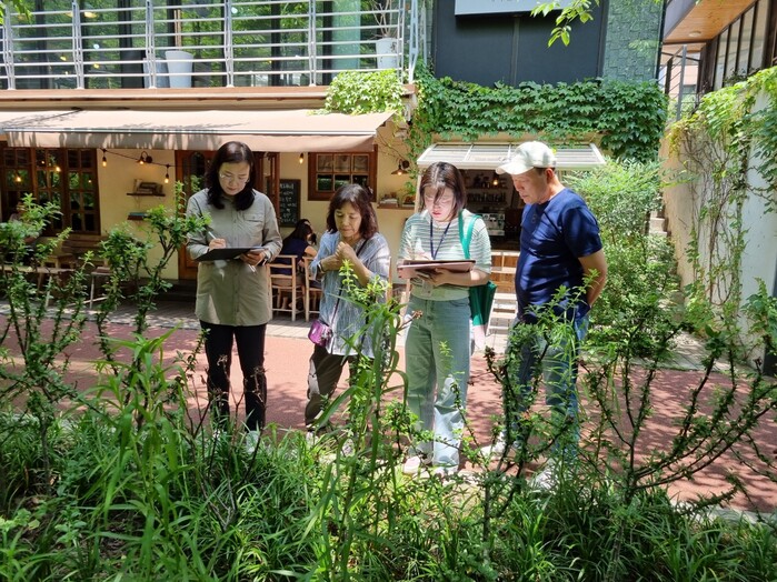 사진/ 손바닥정원단이 손바닥정원을 점검하고 있다.(사진제공=수원시)