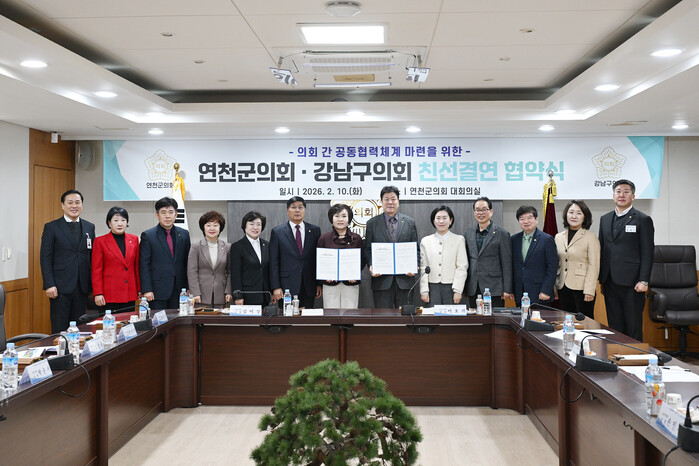 연천군의회(의장 김미경)와 서울시 강남구의회(의장 이호귀)는 2026년 2월 10일 연천군의회 대회의실에서 친선결연식을 개최하고, 양 의회 간 우호 증진과 상호 협력을 위한 친선결연 협약식을 체결했다.