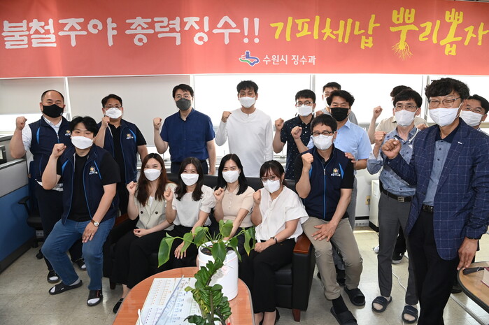 사진/지방세 체납액 징수 업무를 담당하고 있는 수원시 징수과 직원들이 ‘기피체납 뿌리뽑자’는 현수막을 배경으로 파이팅을 외치고 있다.(사진제공=수원시)