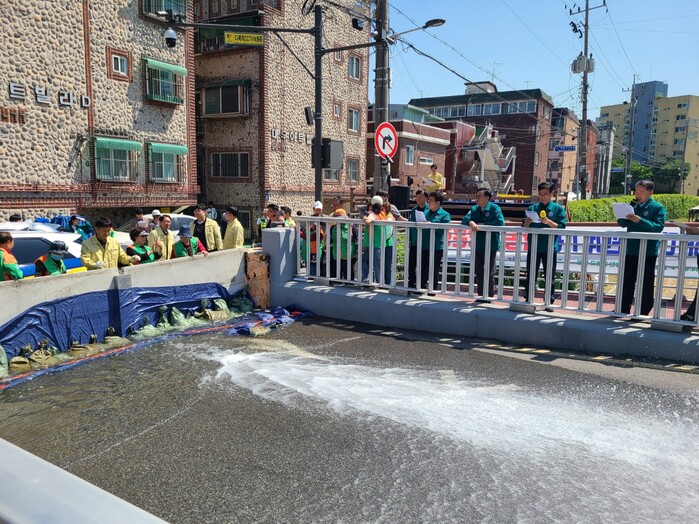 광명시(시장 박승원)와 환경부 한강유역환경청은 2일 오후 개웅교 현장에서 국가하천인 목감천 범람에 대비한 민관합동 훈련을 실시했다.