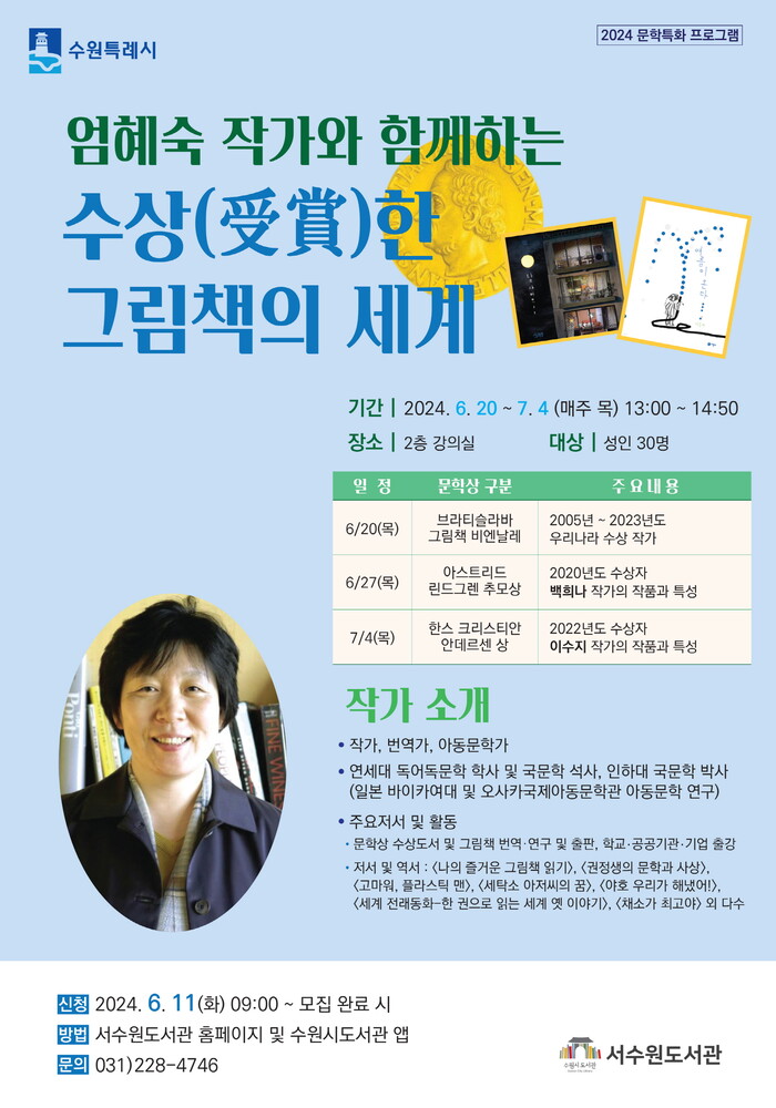 서수원도서관이 11일부터 2024 문학특화 프로그램 엄혜숙 작가와 함께하는 ‘수상(受賞)한 그림책의 세계’ 강좌의 수강생을 모집한다.