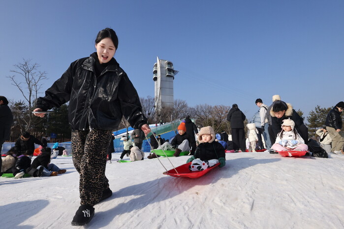 의왕시(시장 김성제) 대표 관광 명소인 왕송호수공원(왕송못동로 307)을 배경으로 펼쳐지는 겨울 축제 ‘겨울아 놀자’에서 방학을 맞은 아이들이 눈썰매를 타며 즐거운 시간을 보내고 있다.