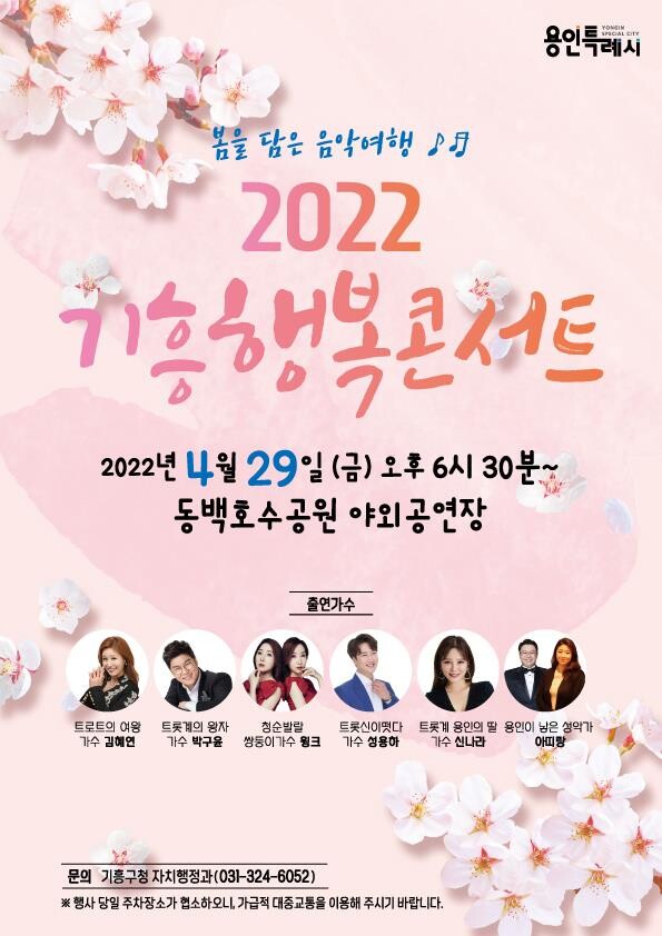 오는 29일 ‘봄을 담은 음악 여행’이라는 주제로 열리는 ‘2022 기흥행복콘서트’는 코로나19로 지친 시민들에게 잠깐의 여유와 힐링의 시간을 선사하기 위해 기흥구가 마련했다.