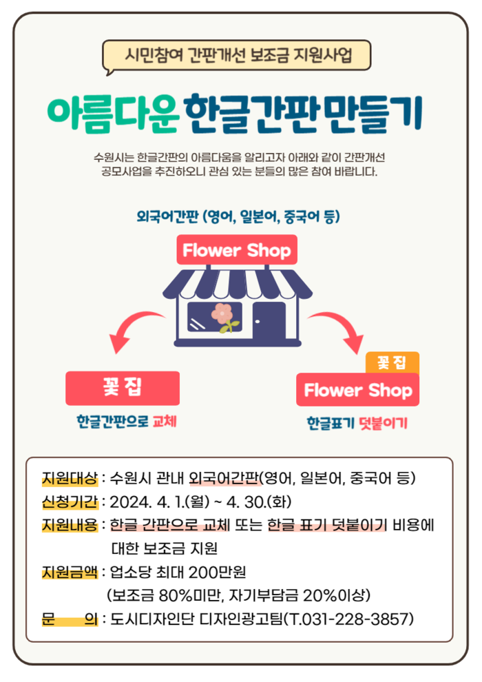 수원시(시장 이재준)가 외국어 간판을 한글 간판으로 교체하는 사업자에게 보조금을 지원하는 ‘아름다운 한글간판 만들기’ 참여자를 4월 30일까지 모집한다.