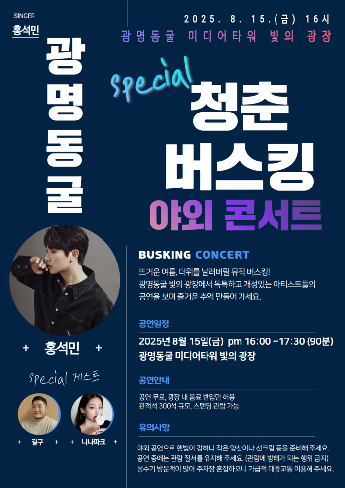 이번 콘서트는 여름 휴가철 광명동굴을 찾은 관광객과 시민들에게 음악으로 특별한 추억을 선사하고 지역 문화예술 저변을 확대하고자 기획되었으며, 감성 짙은 음색의 홍석민, 폭발적인 가창력의 길구, 에너지 넘치는 퍼포먼스로 주목받는 니나파크가 출연하여 무더운 여름 오후를 청춘의 열기로 가득 채울 예정이다.