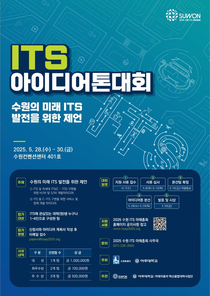 수원시(시장 이재준)와 아주대학교가 주최하는 ‘2025 수원 ITS 아이디어톤 대회’가 2025년 수원 IT 아태총회 기간(5월 28~30일) 중 열린다.