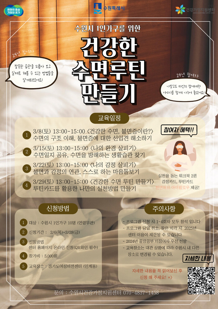 수원시(시장 이재준)가 건강한 수면 습관 형성을 돕는 ‘건강한 수면루틴 만들기’ 프로그램에 참여할 1인 가구를 28일까지 모집한다.