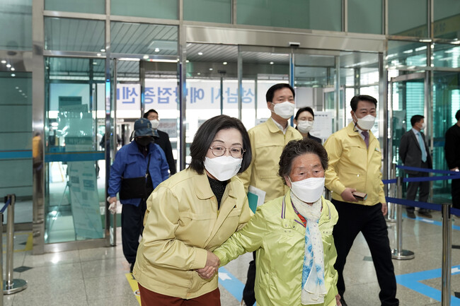 은 시장은 센터 입구에서 한 어르신을 직접 부축하고 들어오며 “어르신 오시는 데 불편하시진 않으셨어요? 접종 잘 받으세요.”라며 인사를 건넸다.