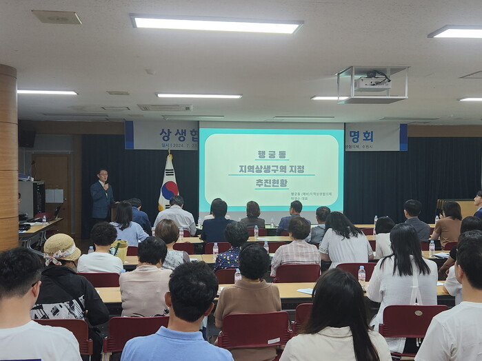 ‘행궁동 지역상생구역 지정’을 추진하고 있는 (예비)지역상생협의체와 수원시가 23일 행궁동행정복지센터 대회의실에서 주민설명회를 열고, 지역상생구역 내 임대인·임차인 등에게 상생협약 안을 소개했다.