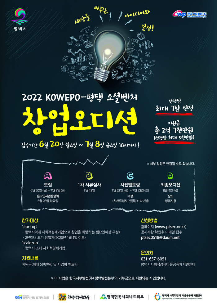 [로컬라이프] 평택시,『2022 KOWEPO-평택 소셜벤처 창업오디션』 개최