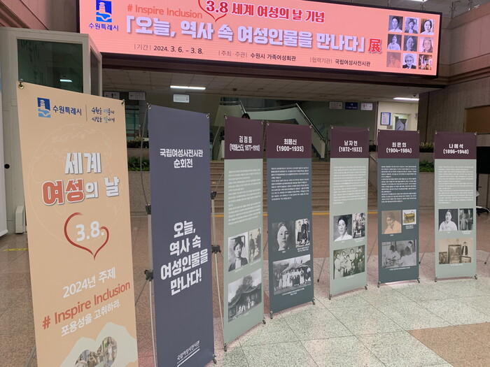 수원시 가족여성회관이 세계 여성의 날(3월 8일)을 기념해 마련한 이번 전시에서는 수원 출신 한국 최초 여성 서양화가인 나혜석, 독립운동가 남자현, 우리나라 최초 여성 비행사 권기옥, 최초 여의사 김점동 등 역사 속 여성 인물 8명을 소개하는 배너를 볼 수 있다.