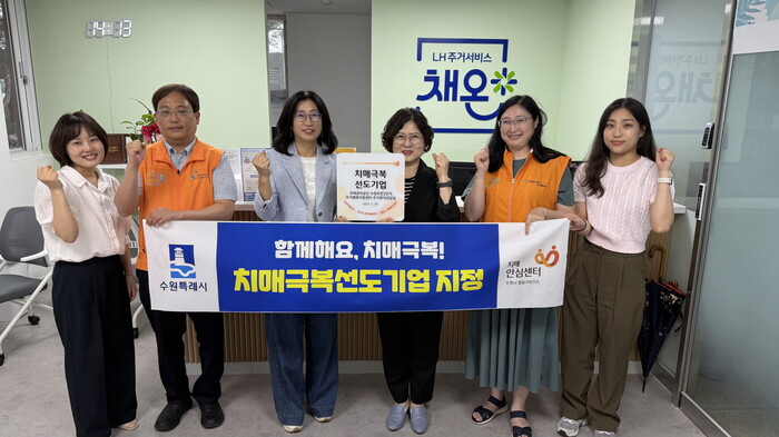 수원시 팔달구 치매안심센터가 치매극복선도단체로 지정한 ‘주택관리공단 수원우만3단지 주거행복지원센터 주거복지상담실’에 25일 현판을 전달하고, 협력 방안을 논의했다.