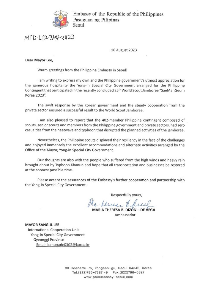 용인특례시(시장 이상일)는 주한 필리핀 대사관이 ‘2023년 새만금 세계스카우트 잼버리 대회’에서 보여준 시의 따뜻한 배려에 고마움을 전하는 감사 편지 2통을 보내왔다고 23일 밝혔다.