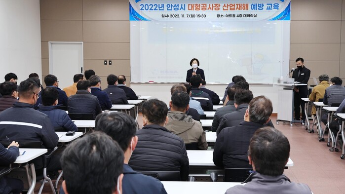 안성시(시장 김보라)는 지난 7일, 안성시 대형공사장 산업재해 예방을 위해 80여 명의 관내 대형 공사현장(아파트, 물류창고)의 현장소장, 감리자 등 건설관계자들을 대상으로 ‘산업재해 예방교육’을 실시했다.