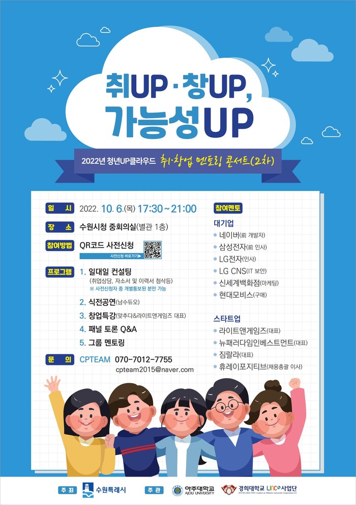 수원시가 주관하고 아주대학교‧경희대 LINC 3.0 사업단이 주최하는 ‘2022년 청년UP클라우드 취‧창업 멘토링 콘서트(2차)’가 10월 6일 오후 5시 30분 수원시청 중회의실에서 열린다. 수원시는 10월 5일까지 참여할 대학생, 취‧창업 준비 청년을 모집한다.