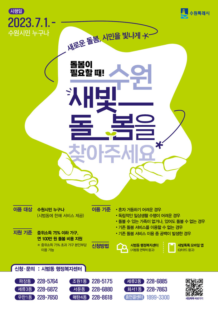 수원새빛돌봄 서비스는 동행정복지센터 돌봄창구에서 전화·방문 신청하거나 모바일 시민참여 플랫폼 ‘새빛톡톡’으로 신청할 수 있다.